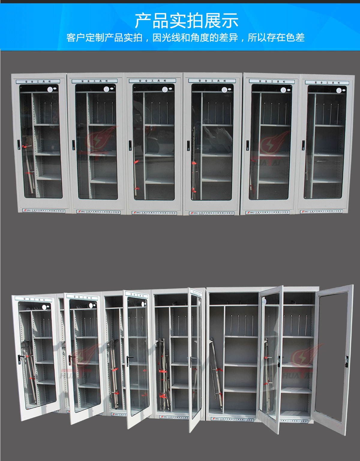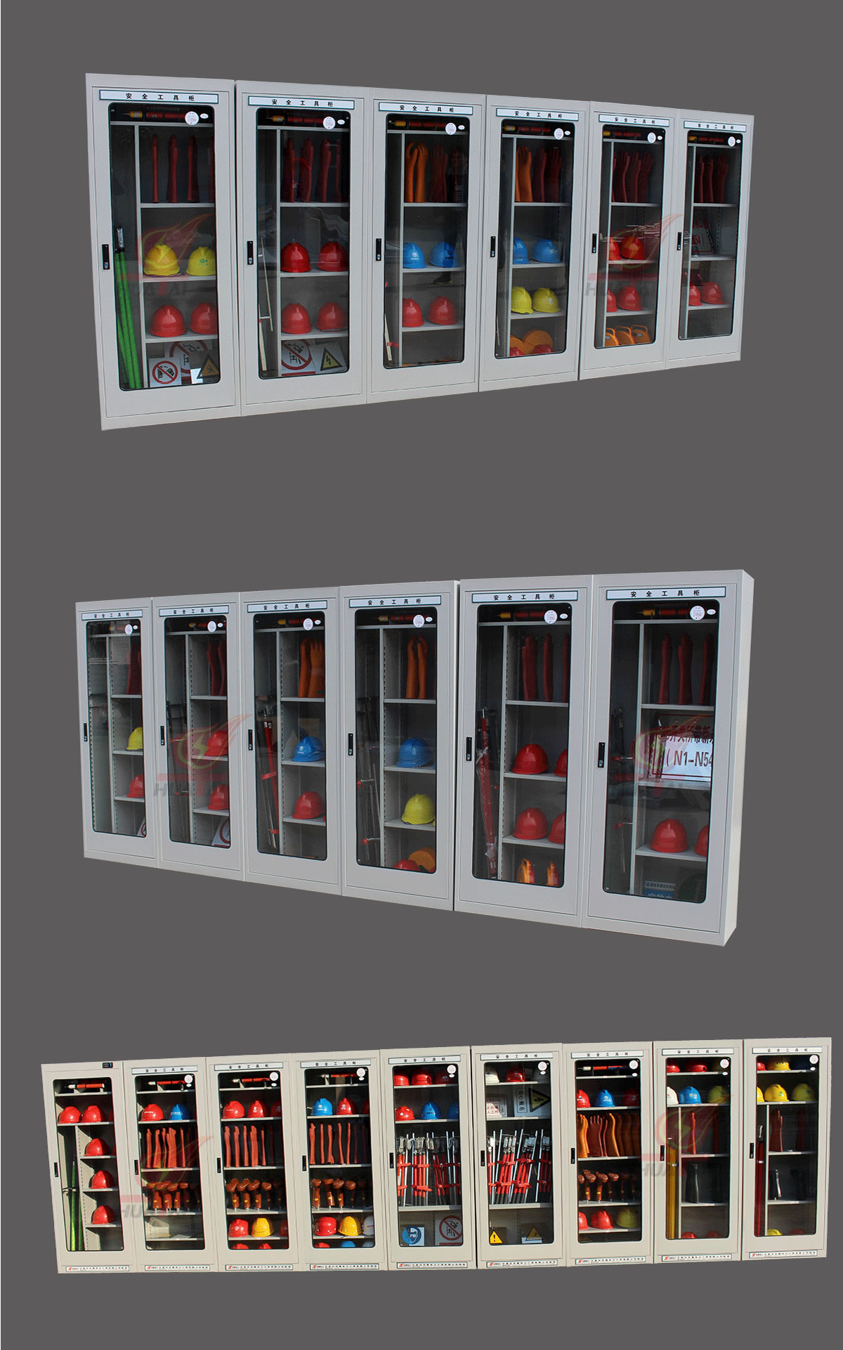 (2)柜體表面為靜電防腐噴塑工藝,顏色為駝灰色,柜門(mén)裝有通體透明鋼化玻璃,透過(guò)玻璃門(mén)可以看到分類有序的各種工器具,便于您的管理。
