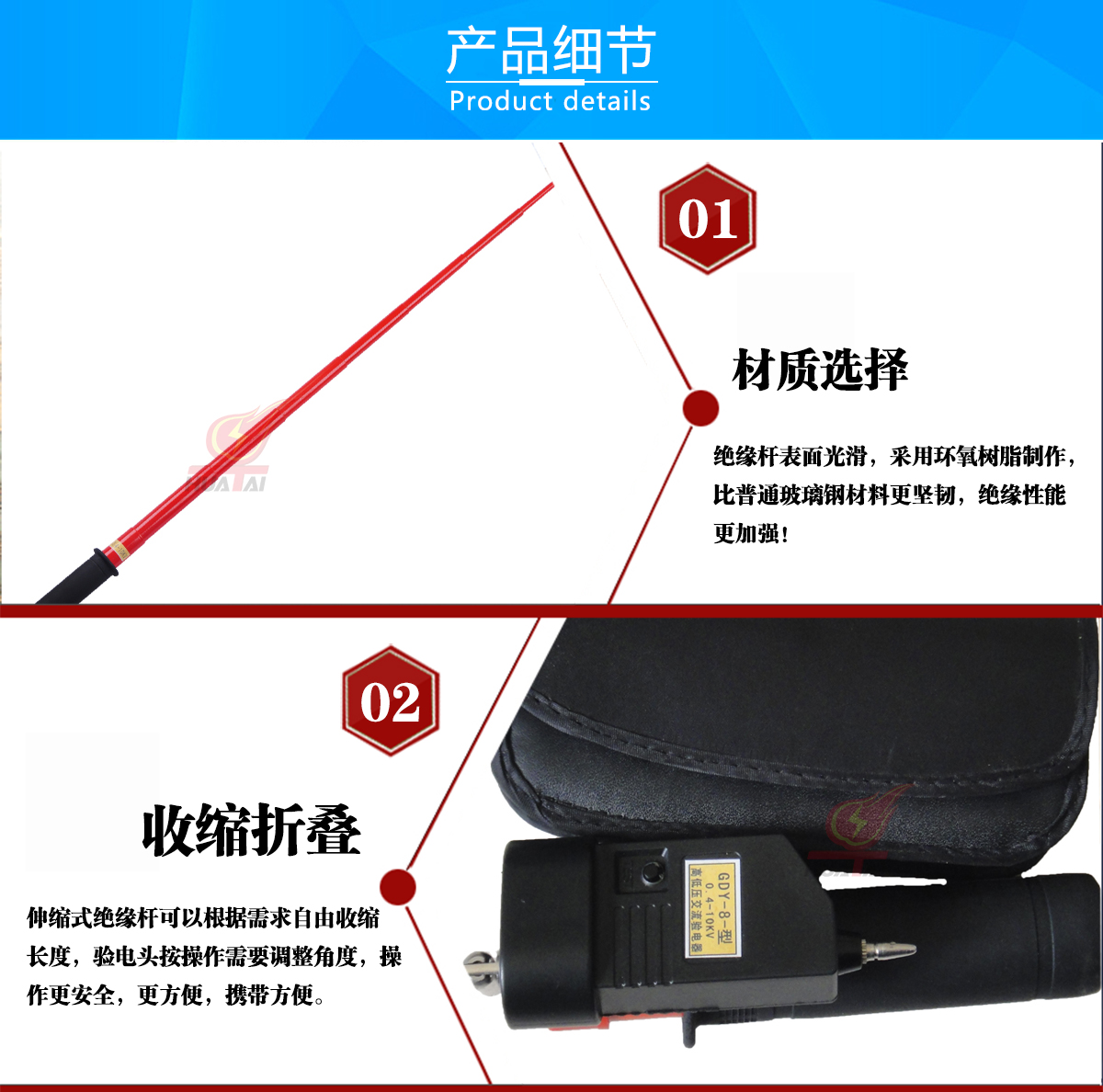 石家莊華泰電力工具有限公司公司生產(chǎn)GDY-II型聲光驗電器,分為0.1kV至500kV七個電壓等級產(chǎn)品,供用戶按實際運行電壓等級選擇訂貨。驗電時它即發(fā)出聲和光雙重報警信號,以提示工作人員被檢線路或設備帶電。