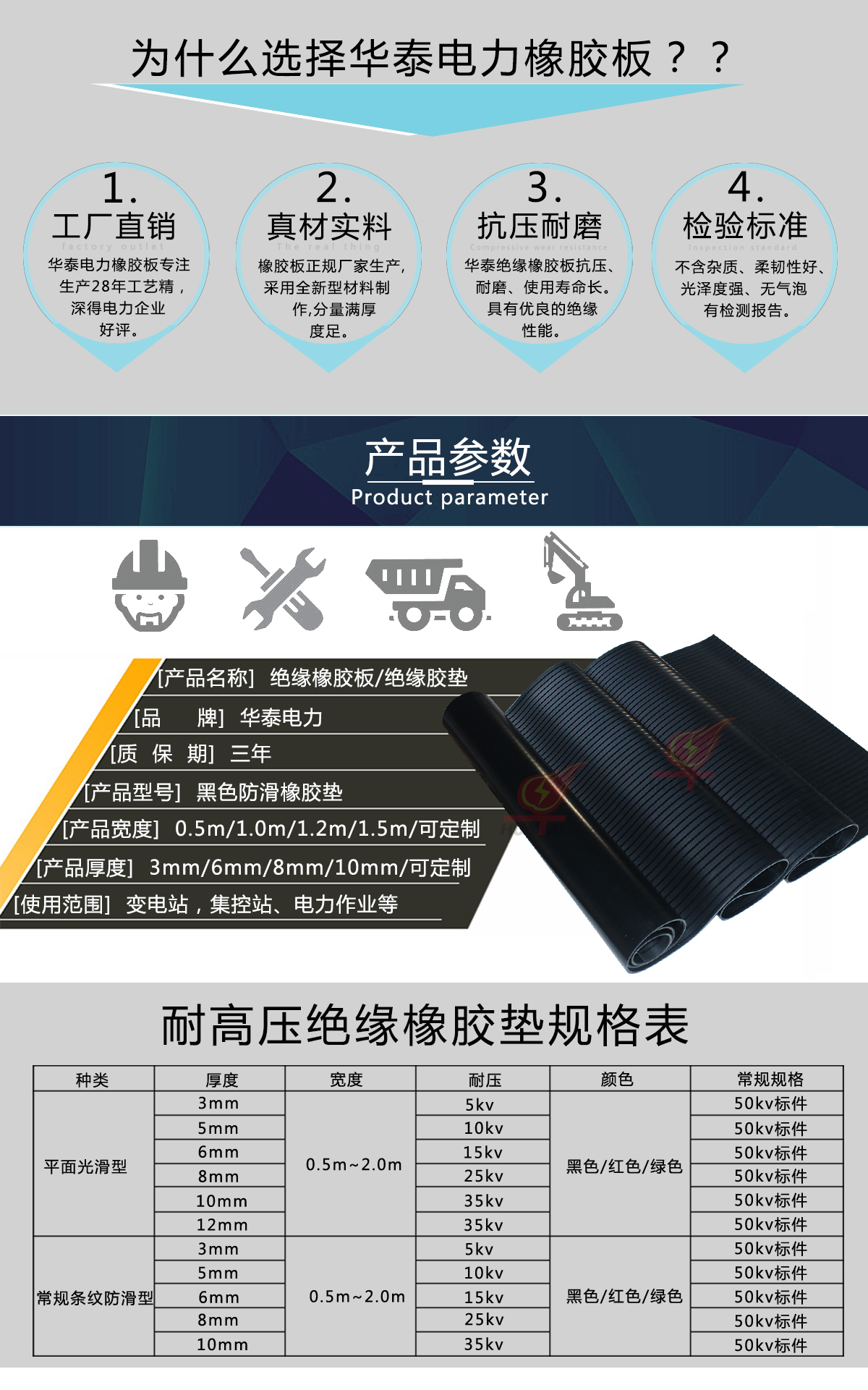 絕緣墊膠板具有較大體積電阻率和耐電擊穿的膠板、用NR,SBR和IIR等絕緣性能優良的非極性橡膠制造。