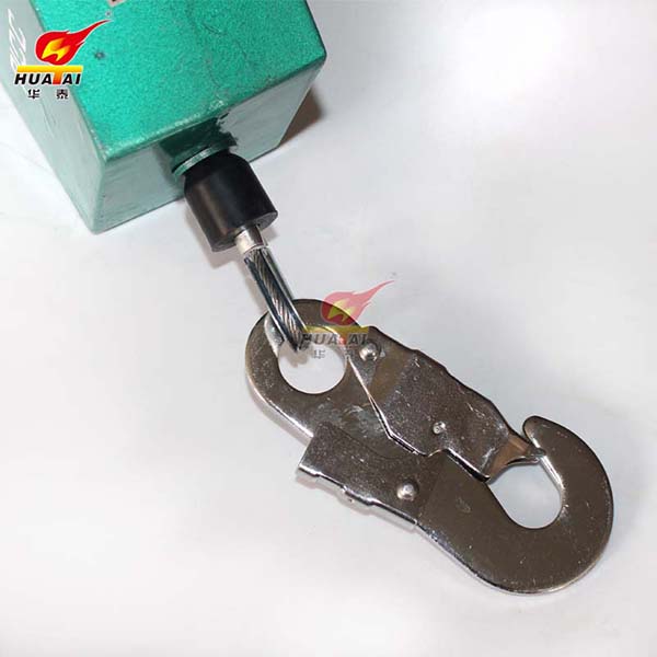 2、使用防墜器前應(yīng)對安全繩 、外觀做檢查,并試鎖2~3次(試鎖方法:將安全繩以正常速度拉出應(yīng)發(fā)出“嗒”、“嗒”聲;用力猛拉安全繩,應(yīng)能鎖止。松手時安全繩應(yīng)能自動回收到器內(nèi),如安全繩未能完全回收,只需稍拉出一些安全繩即可)。如有異常即停止使用。
