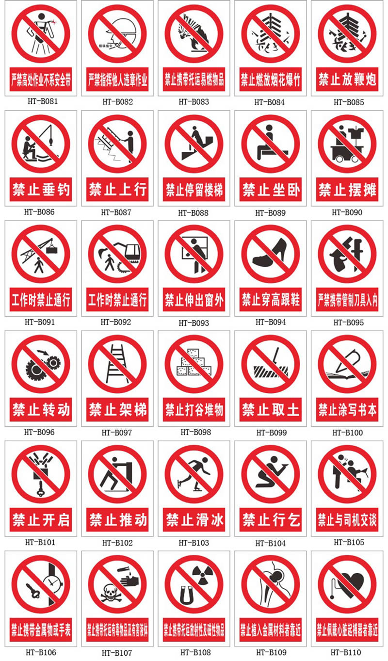 3.禁令類PVC材質安全警示牌:通常為圓形,白底紅邊,紅斜杠黑色圖案。是根據街道、公路和交通量情況對車輛加以禁止或適當限制的標志。如禁止通行、禁止停車、限制速度、限制重量、限制寬度等。